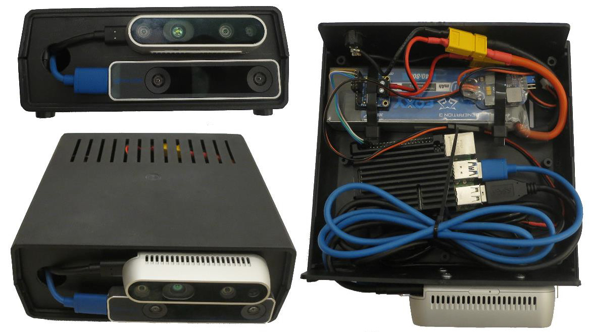 I took a plain plastic box as the enclosure—nothing fancy, just sturdy enough to hold everything. I mounted the two Intel RealSense cameras from the side, with all the electronics tucked safely inside to protect them during handheld use.