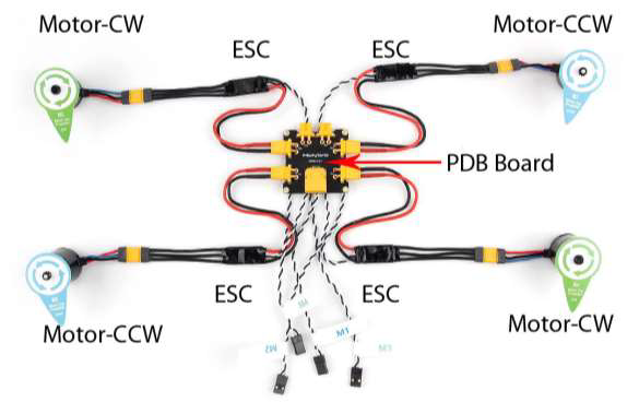 - PDB powers the motors directly through the ESCs and steps down to 5 V for the flight controller and Raspberry Pi.