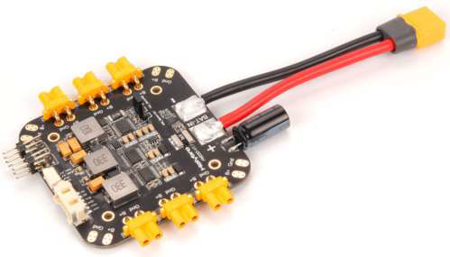 Holybro PM03D Power Module—measures voltage/current in real time (for low-battery warnings), steps down to 5 V for electronics, and distributes battery voltage to ESCs. Critical for safe operation and not killing the battery prematurely.