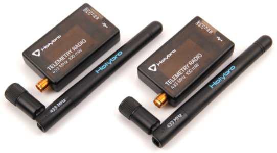 SiK Telemetry Radio V3, 100 mW, 433 MHz—bidirectional for real-time data (position, battery, etc.) and commands from ground station.