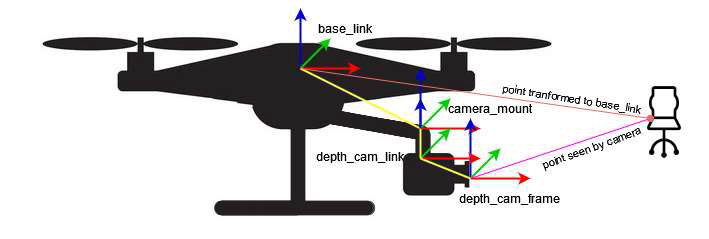 ROS gives tools to broadcast, listen to, and view transforms. In my case, I defined static transforms for everything fixed on the drone using the URDF model (treating the drone as one rigid piece). The only changing transform was between odom (the odometry reference) and base_link (the drone’s center).